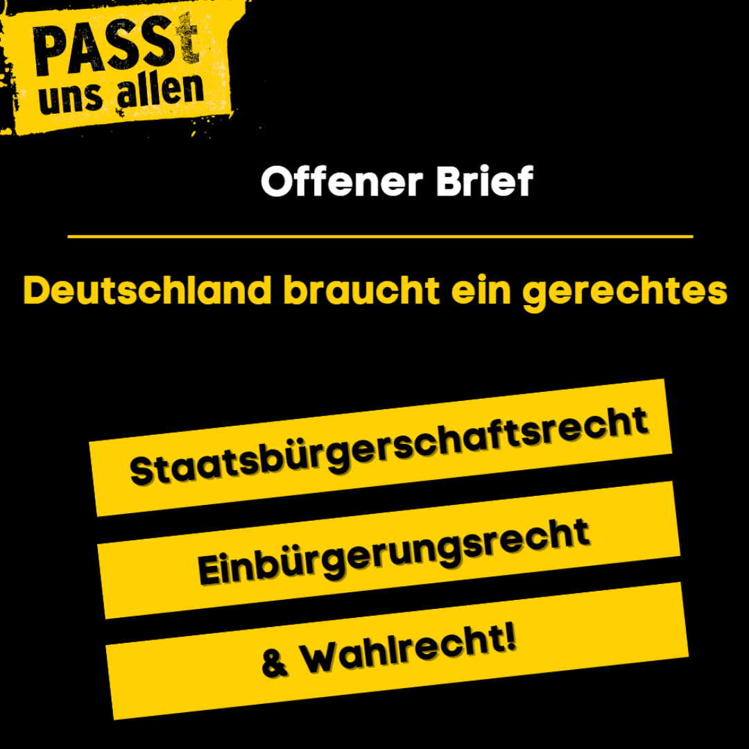 Liebe Freund*innen und Unterstützer*innen, vor zwei Wochen ist das Gesetz zur Modernisierung des Staatsangehörigkeitsrechts verabschiedet worden. Leider mit den Verschärfungen, die wir als Initiator*innen und Teil des Bündnisses “Pass(t) uns allen” kritisiert hatten. Doch wir lassen uns nicht entmutigen. Angesichts der Gefahr, die von Rechts ausgeht, sind unsere Forderungen aktueller denn je! Im Februar erwarten […]