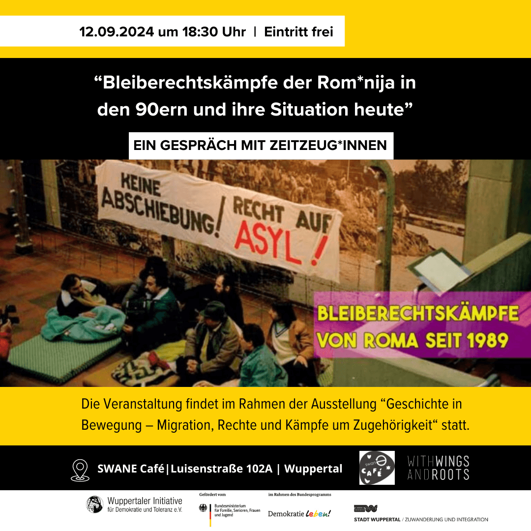 Am 16. September hatten wir eine tolle Veranstaltung im Rahmen unserer Dauerausstellung „Geschichten in Bewegung“ im Café SWANE in Wuppertal. Die Ausstellung lädt dazu ein verschiedene Formen migrantischer Selbstorganisation und widerständiger Bewegungen historisch und biografisch kennenzulernen sowie eigene Erfahrungen und Geschichten zu teilen. In einem monatlich stattfindenden Rahmenprogramm finden Filmvorführungen, Diskussionsrunden, Konzerte und Workshops statt. […]