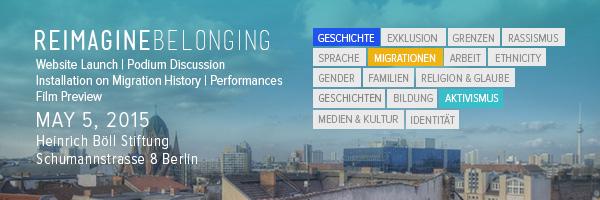 Liebe Freund*innen, nach Jahren des Filmens, Recherchierens, Schreibens und Programmierens wollen wir euch am Dienstag, den 5. Mai 2015 in die Heinrich-Böll-Stiftung zum Launch unserer reimaginebelonging.de (live ab dem 5. Mai) Webseite einladen! Das Programm des Abends: Podiumsdiskussion: „Re:imagine Belonging – Wie wollen wir Deutschland erzählen?“ mitSaraya Gomis (Lehrerin Ernst-Reuter-Oberschule, King Code Projekt);Leila Younes Al-Amayra […]