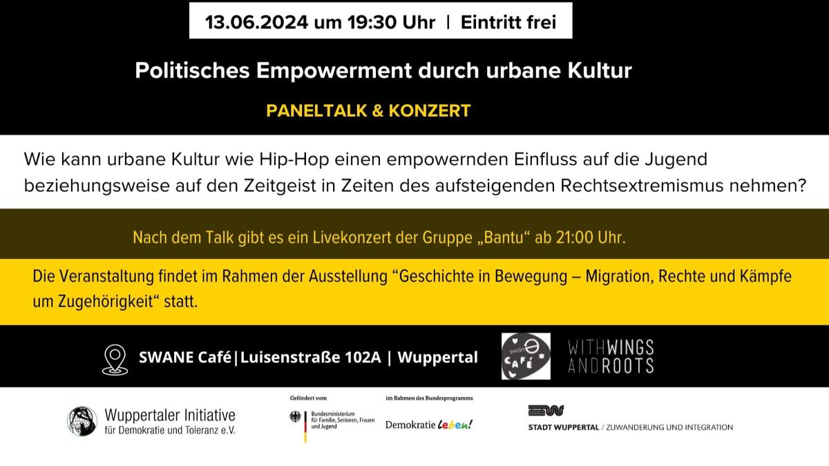Paneltalk “Politisches Empowerment durch urbane Kultur“ & Konzert 📆 13.06.2024 um 19:30 Uhr, Eintritt frei 📍SWANE Café, Luisenstraße 102A, 42103 Wuppertal Eine Veranstaltung im Rahmen der Ausstellung “Geschichte in Bewegung – Migration, Rechte und Kämpfe um Zugehörigkeit“ von With Wings and Roots in Kooperation mit Swane Café. Wie kann urbane Kultur wie Hip-Hop einen empowernden […]