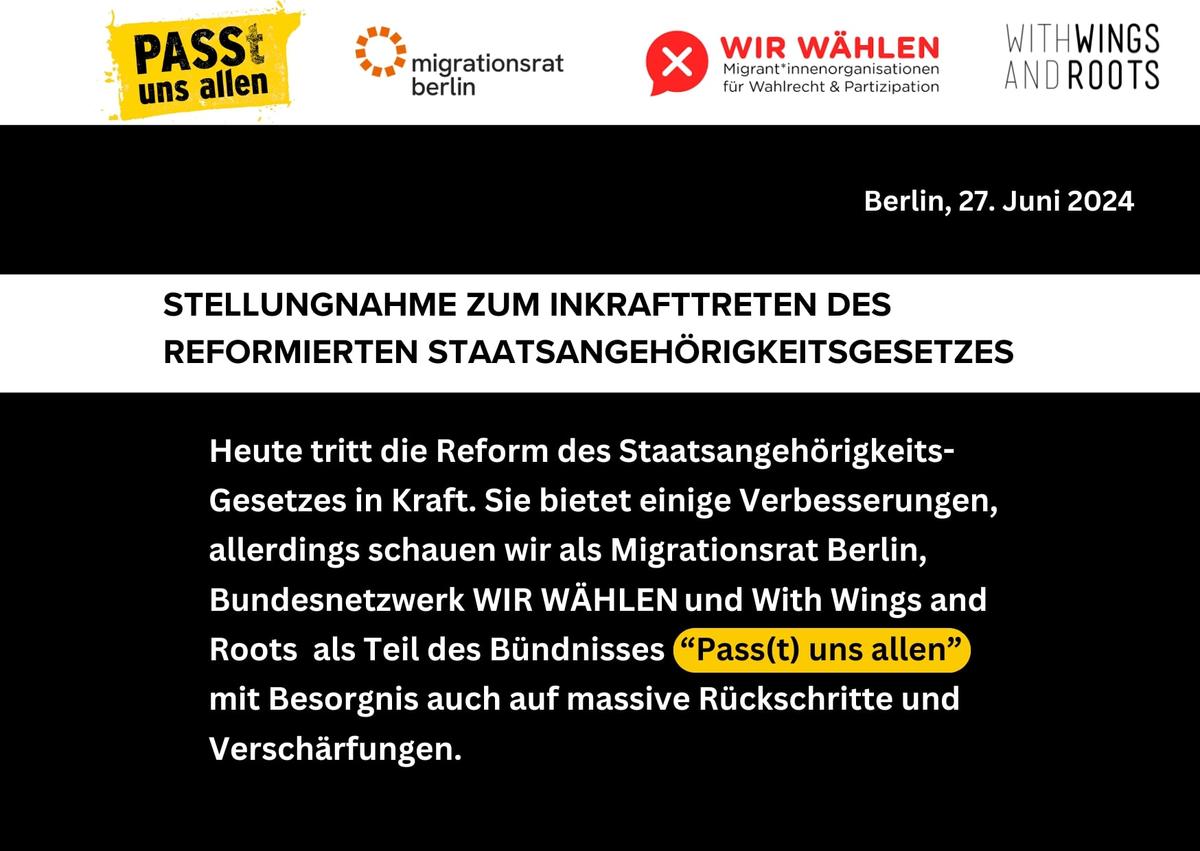 Stellungnahme zum Inkrafttreten des reformierten Staatsangehörigkeitsgesetzes Gemeinsames Statement des Migrationsrat Berlin, Bundesnetzwerk Wir Wählen und With Wings and Roots e.V. als Teil des Bündnisses «Pass(t) uns allen». Am 27. Juni 2024 tritt die Reform des Staatsangehörigkeitsgesetzes in Kraft. Trotz einiger Verbesserungen schauen wir mit Besorgnis auf massive Rückschritte und Verschärfungen. Zunächst einmal: Mit dem Inkrafttreten […]